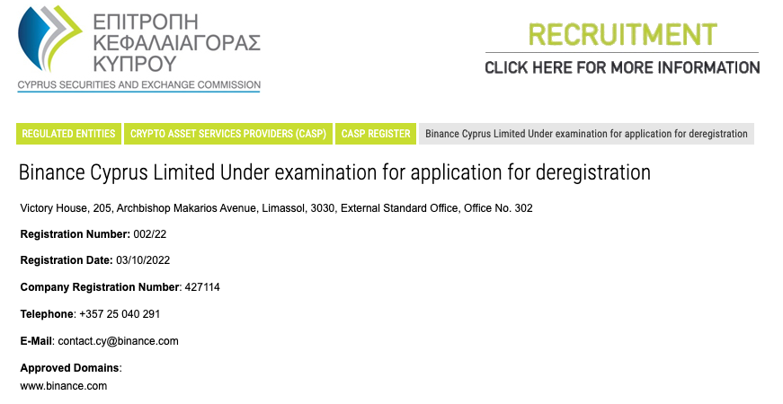 바이낸스가 어느 시점에 키프로스 법인 등록을 취소하려고 했는지는 불분명하다.