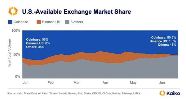 6월 20일 가상자산 분석 업체 카이코는 “주요 10개 미국 가상자산 거래소 가운데 바이낸스US의 시장점유율이 2023년 초 8%에서 현재 1.5%로 하락했다”고 트위터에 밝혔다.