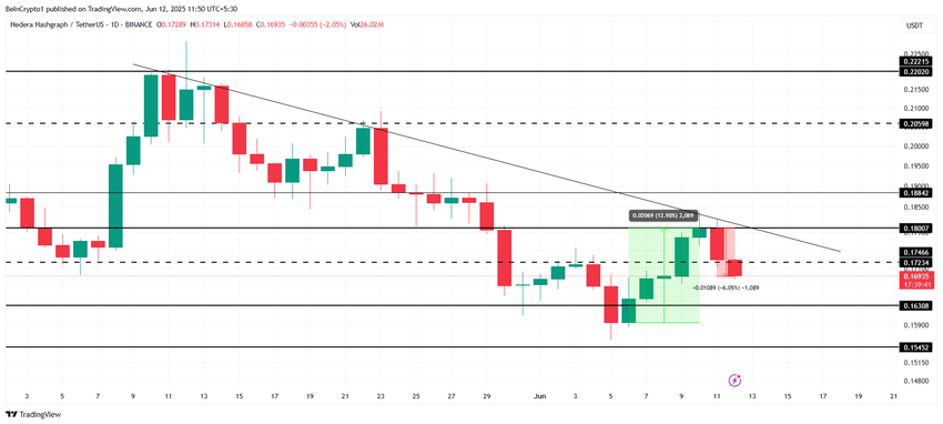 그러나 HBAR이 0.172달러를 회복하고 이를 돌파한다면 시장 심리가 반전될 수 있습니다. 이 수준 이상으로 지속적으로 상승하면 하락 추세가 끝났으며 알트코인이 0.180달러를 넘어설 수 있다는 신호가 될 수 있습니다. 이 경우 HBAR은 0.188달러를 테스트하여 약세 전망을 무효화하고 추세를 잠재적 회복으로 전환할 수 있습니다.