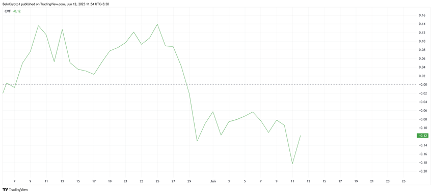 차이킨 자금 흐름(CMF) 지표는 현재 0선 아래에 위치한 약세 영역으로 이동했습니다. 이는 자금 유출이 시장을 지배하고 있는 반면 유입은 여전히 미미한 수준임을 시사합니다. HBAR의 가격 회복에 대한 투자자들 사이의 회의론이 지속적인 하락에 기여하고 있습니다;