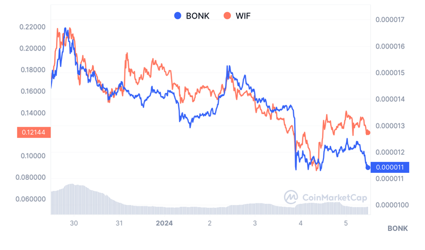 가상화폐 시장은 2024년 초부터 높은 변동성을 경험하고 있다. 솔라나 기반 밈코인 봉크코인(BONK)과 도그위펫(dogwifhat, WIF)은 모두 큰 폭으로 하락했다.
