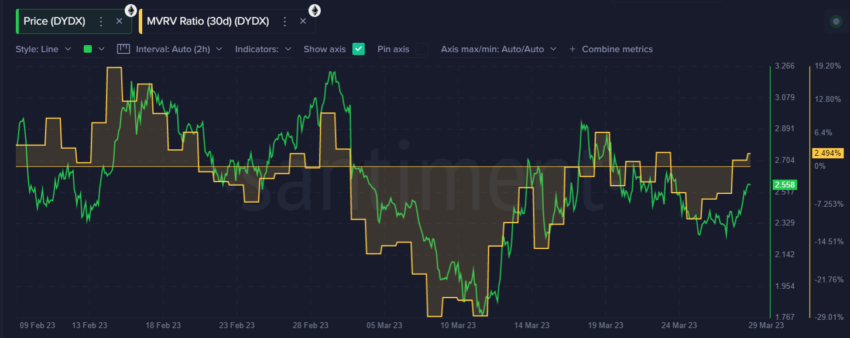 시장가치 대비 실현가치(MVRV)는 향후 dYdX의 잠재적 가격 변동을 가장 잘 나타낸다.