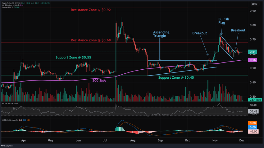 Sponsored Sponsored11월 초에 리플 코인 가격은 빠른 속도로 0.73 달러까지 올랐다가 상대강도지수가 85를 넘으면서 차익 실현이 발생해 후퇴했다. 그 결과 지금과 같은 깃발 횡보 패턴이 나타나게 되었다.