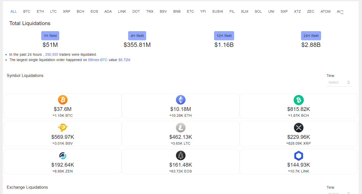 주요 청산은 바이낸스(Binance), 후오비(Huobi), 비트맥스(BitMEX)에서 발생했다. 가장 큰 단일 청산은 비트맥스의 비트코인으로 트레이더는 872만 달러의 엄청난 손실을 보았다.