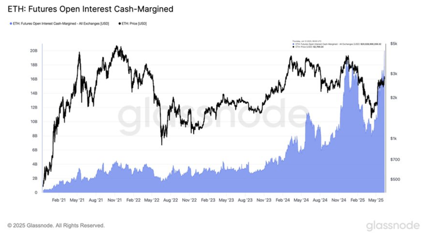 “이더리움 선물 미결제 약정(현금 마진)이 200억 달러를 돌파하며 사상 최고치를 기록했습니다… 트레이더들이 스테이블코인을 사용해 자금을 조달하면서 레버리지는 계속 증가하고 있습니다.”라고 Glassnode 는 게시물에서 썼습니다.