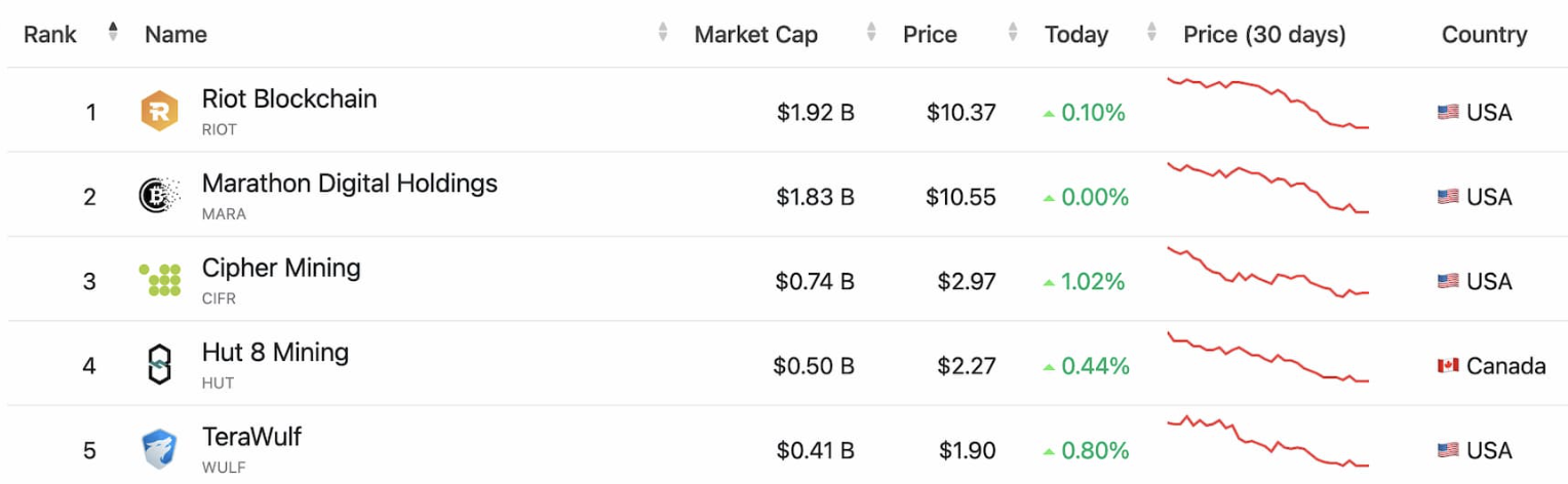 Sponsored라이엇 플랫폼(RIOT)이 19억 2000만 달러로 선두인 가운데, 마라톤 디지털(MARA) 18억 3000만 달러, 사이퍼 마이닝(CIFR) 7억 4000만 달러, 헛8 마이닝(HUT) 5억 달러, 테라울프(WULF) 4억 1000만 달러 순이다.