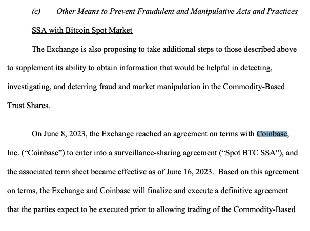 나스닥이 SEC에 제출한 신청서. 코인베이스가 감시 공유 파트너라고 명시돼 있다. 출처:SEC