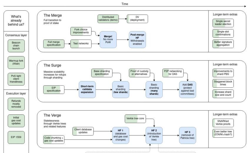 부테린의 로드맵에 따르면 통합 이후 이더리움은 더 버지(The Verge)와 더 퍼지(The Purge)를 통한 추가 개선안을 도입하기 전 샤딩을 통한 확장에 초점을 맞출 계획이다. 이 과정을 통해 검증과정을 개선하고 노드의 데이터 부담이 줄어든다.