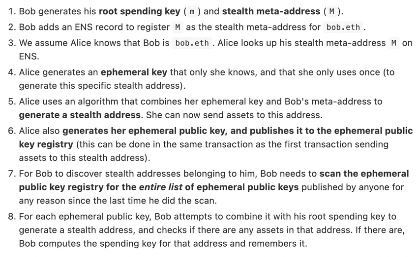 비탈릭은 스텔스 주소를 “앨리스나 밥이 생성할 수 있지만 밥만이 제어할 수 있는 주소”라고 정의하고 있다. 새로운 워크플로우에는 밥이 “지출 키”(spending key)를 생성하고 이를 사용하여 스텔스 메타 주소를 생성하는 작업이 포함된다.
