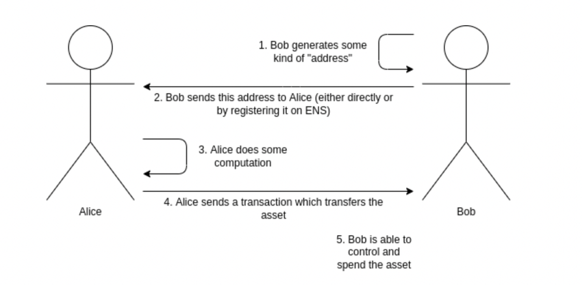 비탈릭 부테린은 앨리스(Alice)와 밥(Bob)이라는 두 사람의 예를 들어 현재 거래 시스템의 프라이버시 문제를 설명했다. 현재 밥은 자신의  지갑 주소를 직접 또는 이더리움 네임서비스(ENS)를 통해 앨리스에게 보내 자산을 받는다. 그러면 앨리스는 그 자산을 밥의 지갑으로 보내고, 밥은 받은 자산을 소비 및 통제할 수 있다.
