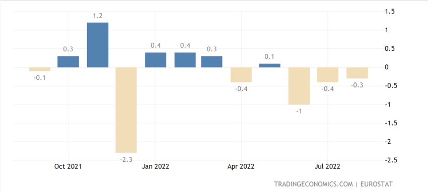 2022년 11월 8일 출시 예정인 2022년 9월 유로존 소매 판매는 이 지역이 경기 침체로 빠져들고 있음을 나타낼 수 있다. 2022년 8월 소비자 수요를 대표하는 소매 판매는 2022년 7월에 비해 0.3% 감소했다.