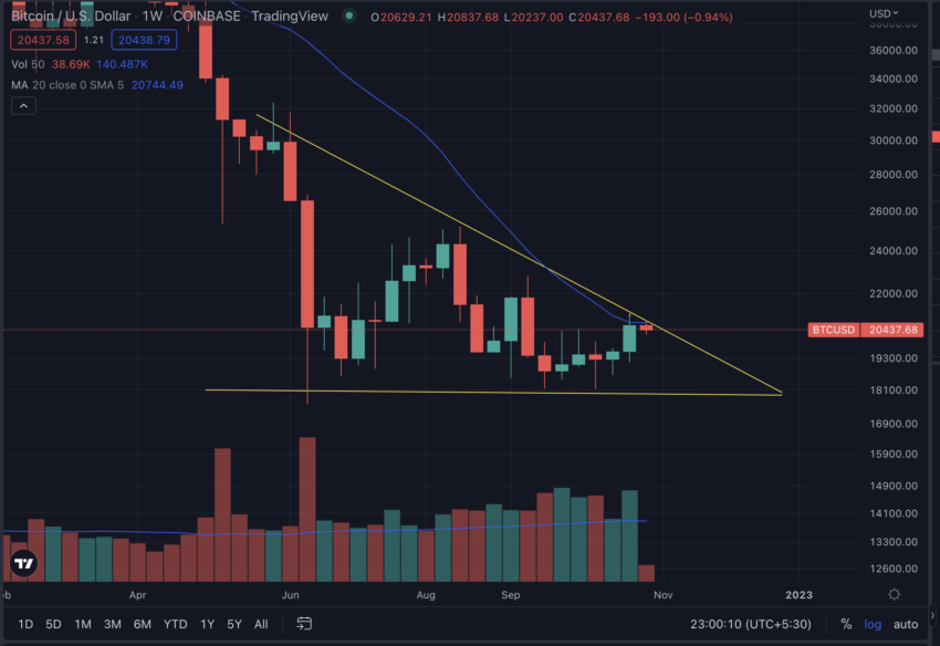 하강 삼각형은 일반적으로 약세 차트 패턴으로 간주됩니다. 뿐만 아니라 비트코인도 7개월 만에 처음으로 20주 단순이동평균지수(SMA)를 테스트하고 있다.