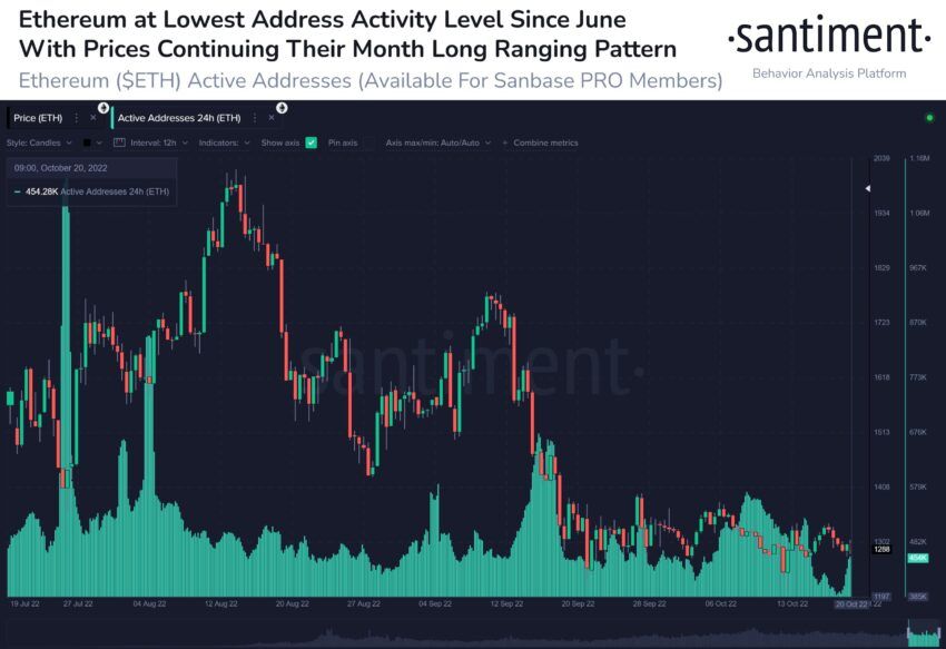 Sponsored한 가지 걱정스러운 추세라면 이더리움 머지(Merge) 후 위크 핸드(weak hand 비트코인을 최근에 시작한 사람들이 퍼드로 인해 불안해서 팔려고 하는 것)가 계속 떨어지면서 이더리움의 활성 주소가 4개월 만에 최저치로 내려갔다는 사실이다. 이는 가격 조치가 정체되어 있기 때문에 참가자들 사이에서 높은 수준의 무관심을 나타낸다. 10월 17일에는 네트워크의 활성 주소가 6월 26일 이후 처음으로 40만 개 미만이었다.