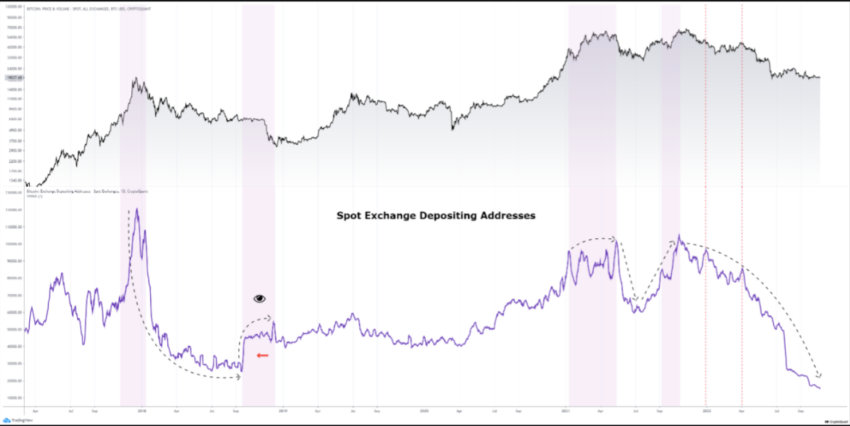 현시기와 비교하면 급격한 가격 하락을 보인 이 데이터 시스템의 정점을 제외하면 현물거래소를 위해 BTC를 입금한 주소 수는 수년 만에 최저 수준이다.