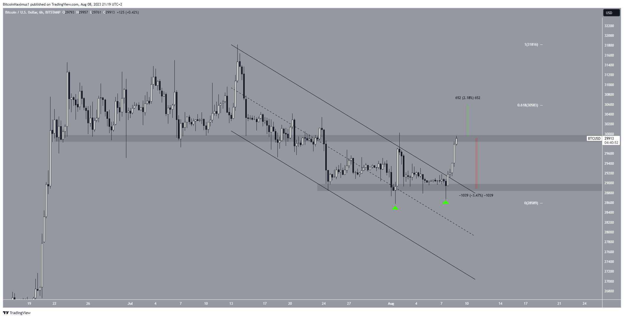 SponsoredBTC 가격은 7월 15일 3만 8104달러로 최고치를 기록한 이후 하락하면서, 8월 1일 최저치인 2만 8585달러로 저점을 찍었다.