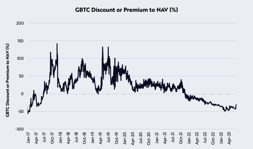 Sponsored이 가운데 그레이스케일 비트코인 트러스트(GBTC) 순자산가치(NAV) 할인율은 42%에서 30%로 하락해 연중 최저치를 기록했다. 이는 GBTC 주가가 기초 자산, 즉 비트코인 가격보다 30% 낮다는 것을 의미한다. 이처럼 할인 폭이 감소한 것은 블랙록을 필두로 주요 자산운용사가 비트코인 현물 상장지수펀드(ETF)를 신청한 결과로 풀이된다.