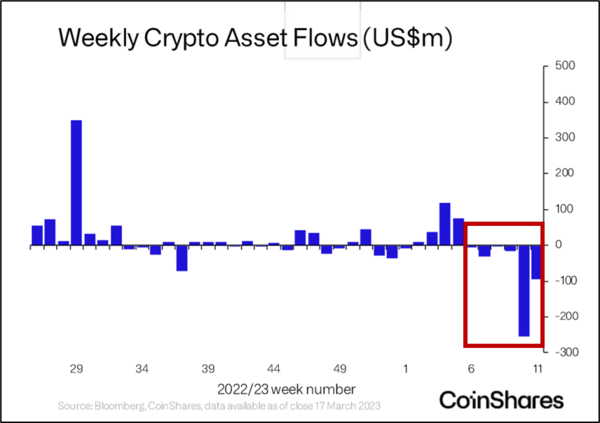 가상자산 운용사 코인쉐어즈(Coinshares)는 3월 20일(현지시각) “가상자산 투자 상품이 지난주 총 9500만달러(약 1200억원) 빠져나가며 6주 연속 감소했다”고 밝혔다.