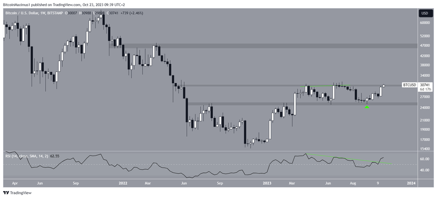 주간 기술 분석에 따르면, 비트코인 가격은 9월 이후 2만5000달러 장기 수평 지지선에서 반등하며 상승했다.