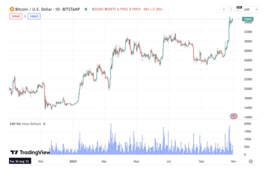 비트코인은 전 세계를 놀라게 한 돌파 움직임을 보이며 3만 5000달러 턱밑까지 왔다. 열흘이라는 짧은 기간 동안 비트코인은 30% 가까이 상승했으며 주저 없이 3만 달러 저항선을 뚫었다. 거래대금은 통상적으로 기록하던 100억~150억 달러 수준에서 550억 달러까지 치솟았다.