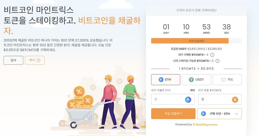 현재 비트코인 마인트릭스는 사전 판매를 진행 중이다. 토큰 가격은 0.0113 달러다.