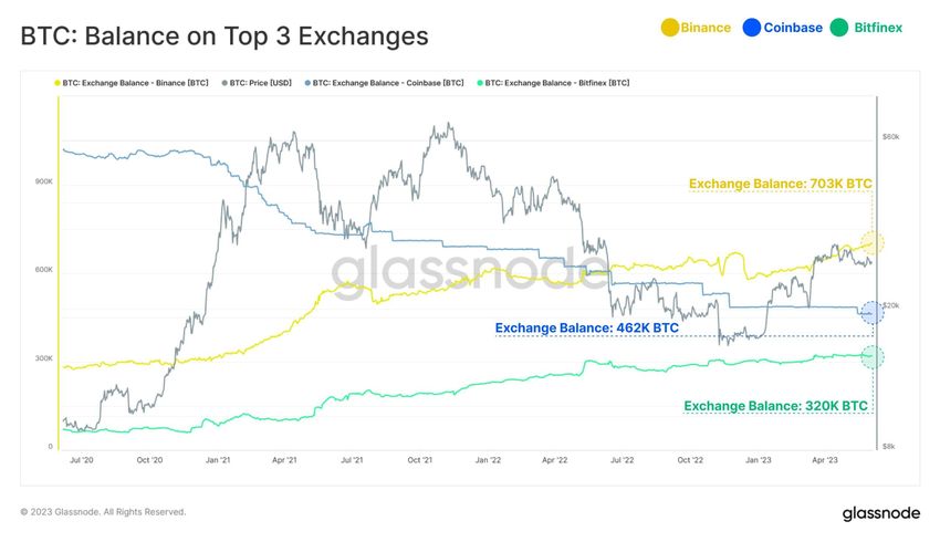 상위 3개 거래소의 비트코인 잔고 현황. 출처: Glassnode