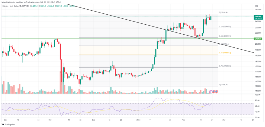 그리고 해당 저항선은 2022년 11월 21일 바닥을 쳤던 1만5487달러로부터 전체 상승분을 계산했을 때 0.382 피보나치 되돌림 수준의 비트코인 가격과 일치한다. 0.382 피보나치 되돌림 수준에서의 소폭 조정은 강세 신호로, 상승 추세가 계속될 가능성을 시사한다.