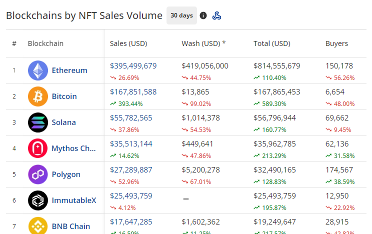 비트코인이 솔라나(SOL)를 제치고 최근 한 달 동안 NFT(대체불가토큰)가 가장 많이 거래된 블록체인 2위에 올랐다.
