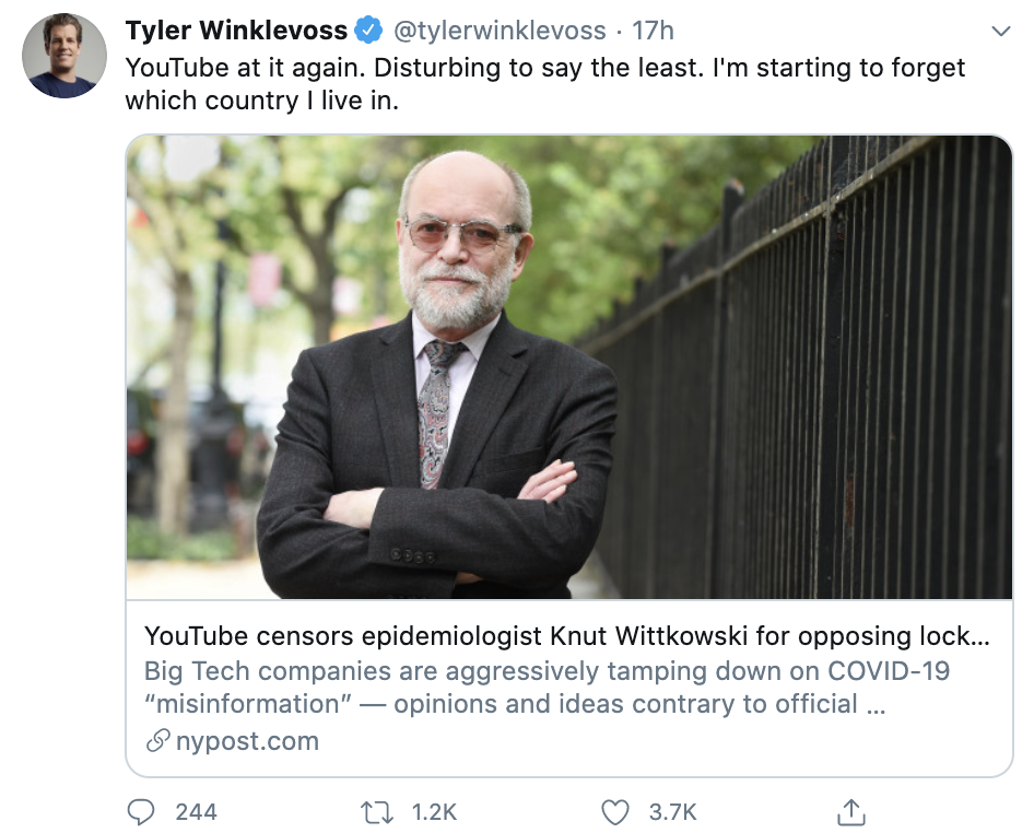 미국의 암호화폐 거래소인 제미니(Gemini)의 공동 창업자이자 스테이블코인인 제미니달러의 창시자인 타일러 윙클보스는 최근 트위터에 “유튜브가 또 그 일을 하고 있다”고 언급하며, 크누트 M. 위트코프스키 박사의 동영상을 삭제하기 위한 유튜브의 행적을 비판했다.