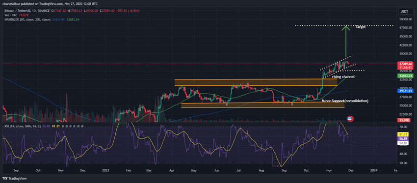 반대로 약세가 3만 8,000달러를 저항선으로 삼아 계속해서 가격을 끌어내린다면 비트코인이 다시 3만 4,900달러까지 후퇴할 가능성이 존재한다. 이 가격대는 상승 채널의 아래에 분포하며 50일 단순이동평균선(SMA)과 만난다.
