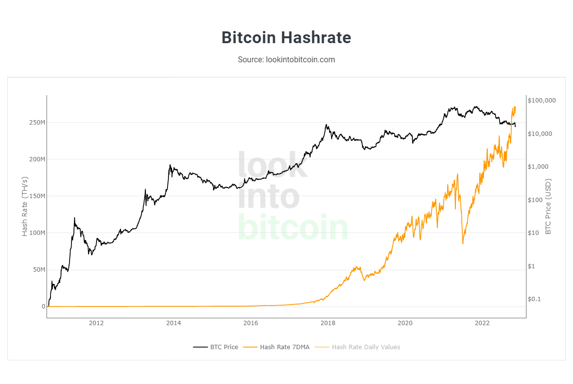 비트코인 채굴자들이 어려움을 겪고 있지만, 비트코인 네트워크의 해시레이트가 사상 최고 수준이라는 점은 좋은 소식이다. 이는 채굴자 항복이 지속되고 BTC 가격이 하락하더라도, 대형 채굴장은 여전히 운영이 가능하다는 의미다.