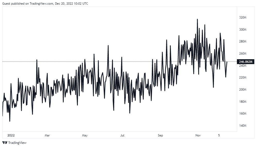 올해 6월 이후 점점 우상향하던 비트코인 해시레이트 역시 11월 초 이후 점점 감소하는 추세다. 해시레이트란 채굴 과정에서 사용되는 컴퓨팅 파워의 크기를 말한다. 트레이딩 뷰 자료에 따르면 최근 비트코인 해시레이트는 246.062 EH/s로 나타났다.