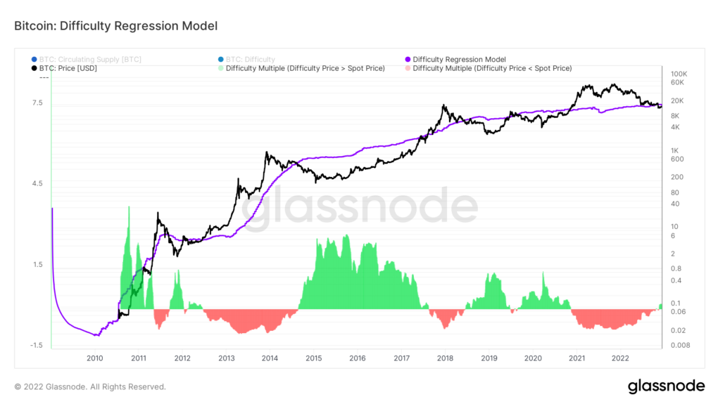 암호화폐 데이터 분석 기업 글래스노드가 만든 비트코인 채굴난이도 회귀 모델은 채굴 장비나 전력 비용 등 부대적 비용을 따지지 않고 비트코인 채굴에 대한 평균 생산 원가 비용을 추정할 때 사용하는 방법이다. 지난 11월 초 FTX의 파산 신청 이후 비트코인 가격이 회귀 모델 비용 아래로 하락했고, 이후에는 계속 비슷한 수준이 유지되고 있다.