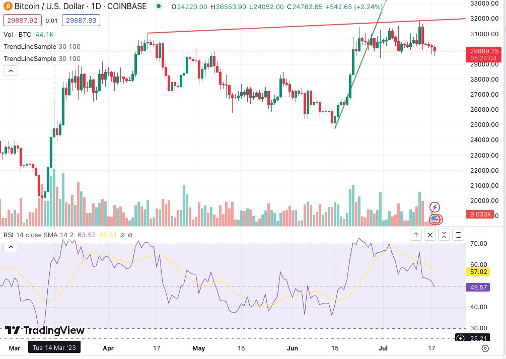 현재 RSI는 49.7로, 6월 중순 상황과 비슷하다. 이때 비트코인 가격은 2만 6000달러에서 2만 7000달러 대를 오갔다.