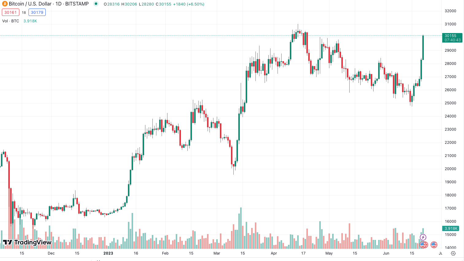 암호화폐 거래소 비트스탬프에 따르면, 21일(현지시각) 비트코인은 전날 대비 5% 이상 상승하며 3만 달러에 거래됐다.