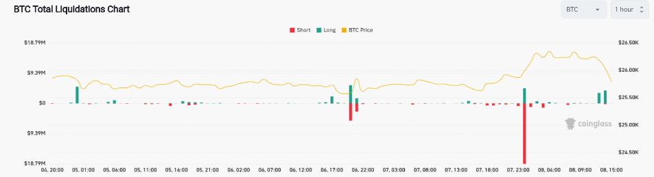 8일 트레이딩뷰의 데이터를 보면, 비트코인은 숏과 롱 포지션을 모두 청산하는 움직임을 보였다. 이때 비트코인은 상승 추진력을 보이며 월스트리트 장 마감 후 한때 2만 6400달러까지 돌파하며 회복세를 나타냈다.