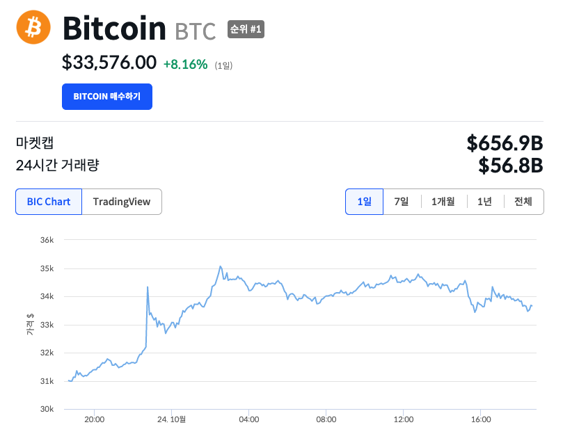 하루 전, 비트코인은 ‘비트코인 현물 상장지수펀드(ETF)’ 승인 가능성에 대한 기대감으로 3만 5200달러까지 급등하기도 했다. 이는 17개월 이내 최고가였다.