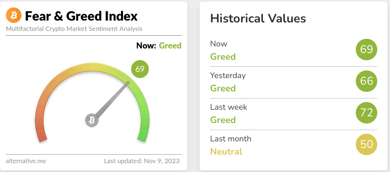 새로 알게 된 것: 비트코인은 거시적 악재에도 불구하고 가격이 계속 상승하고 있습니다. 연초 대비 121% 올랐고, 옵션 시장에서는 비트코인 가격이 4만 달러를 향하고 있습니다. 지난 2주간 가격 변동으로 공포 탐욕 지수는 69로 탐욕을 나타내며, 2021년 11월 비트코인 가격이 6만 9789달러로 사상 최고치를 기록한 이후 가장 높은 수준을 기록했습니다.