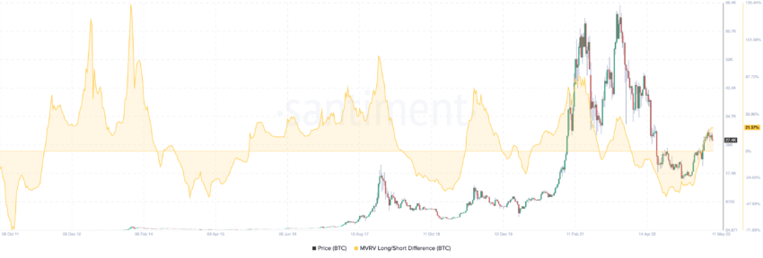 여기서 주목할 것은 미실현 수익이 많다는 것을 나타내는 MVRV의 높은 수치가 역사적으로 비트코인 4년 주기에 맞춰 늘 정점을 찍었다는 점이다.