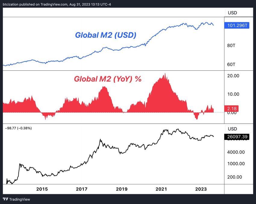 Sponsored“해당 주기는 반감기보다 오히려 M2 통화 공급 주기와 더 밀접한 상관관계를 보인다. 최근 들어 글로벌 M2 통화 공급은 자체적인 ‘4년 주기’를 나타내는데, 이는 비트코인을 포함한 대부분 위험 자산에 반영돼 있다.”