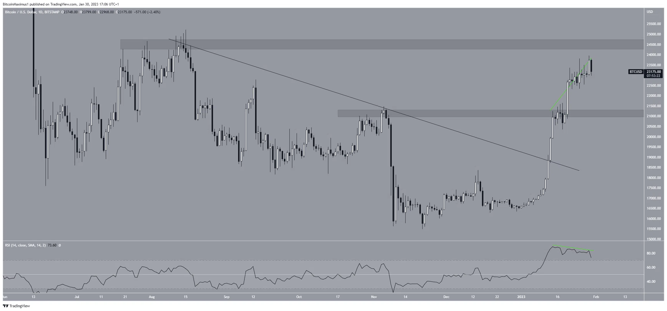 최근 BTC 가격은 최고치 2만3954달러에 도달했지만, 약세 징후가 보이기 시작했다. 이러한 징후는 일일 RSI와 캔들스틱 패턴에서 모두 나타난다.