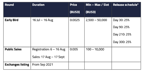 퍼블릭 세일: 등록: 2021년 8월 6일 – 8월 16일 | 판매: 2021년 8월 17일 – 2021년 9월 17일 | BUSD 0.005 | 유효 공급량: 10억 BHO 토큰