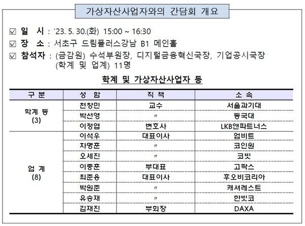 한 가상자산 투자 업계 관계자는 “주요 거래소 대표가 개인 사정을 이유로 뒤늦게 불참한 것도 이상하지만 금감원 보도자료에 빗썸 이름이 아예 빠진 것도 이례적”이라고 말했다.
