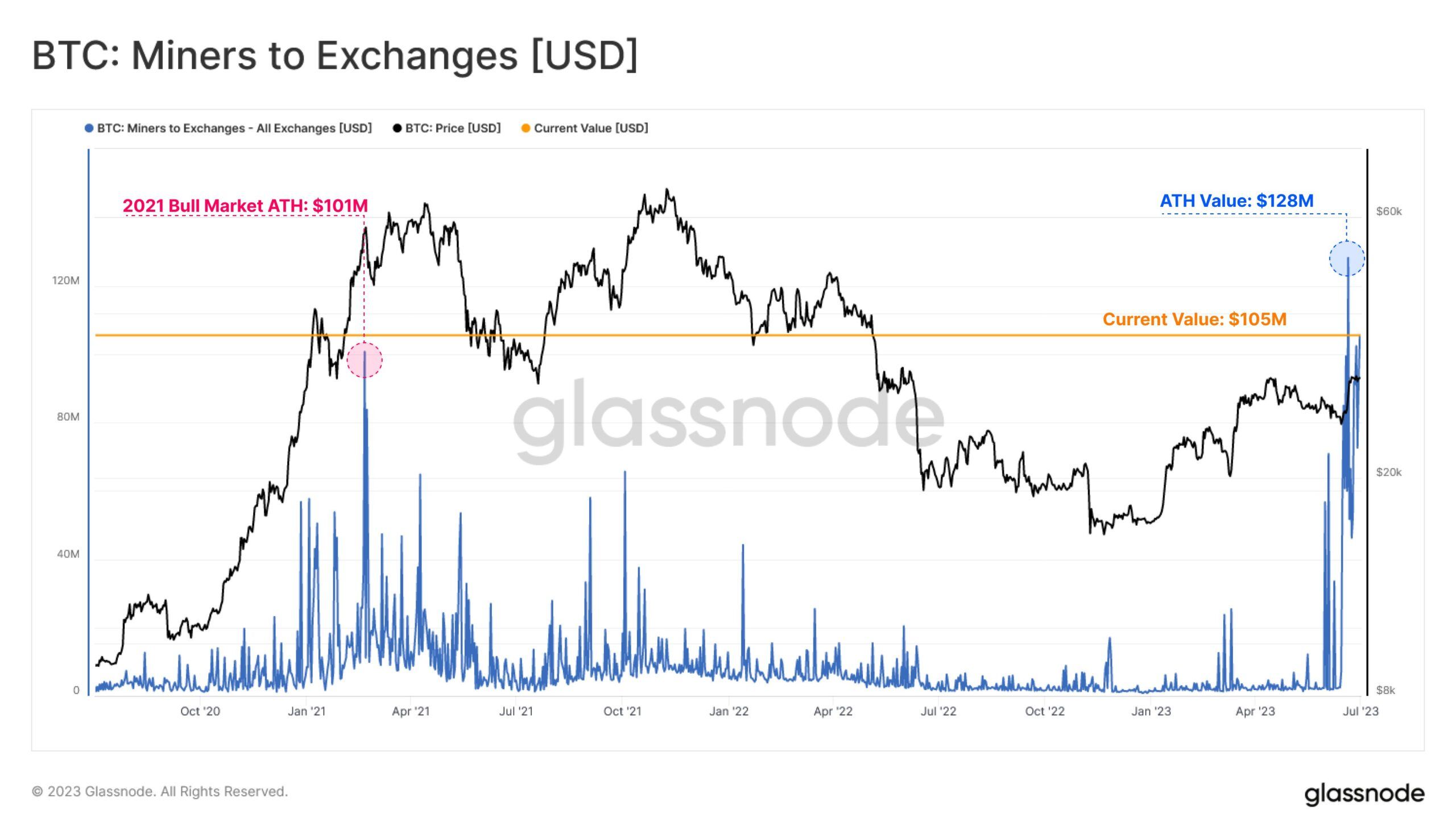 글래스노드 자료에 따르면 지난 2021년 상승장에서 기록됐던 채굴자 거래소 전송량 최고치는 1억100만달러였다. 채굴자 전송량이 크게 치솟은 이후 두 달여간 횡보 끝에 비트코인 가격이 단기 하락했다.
