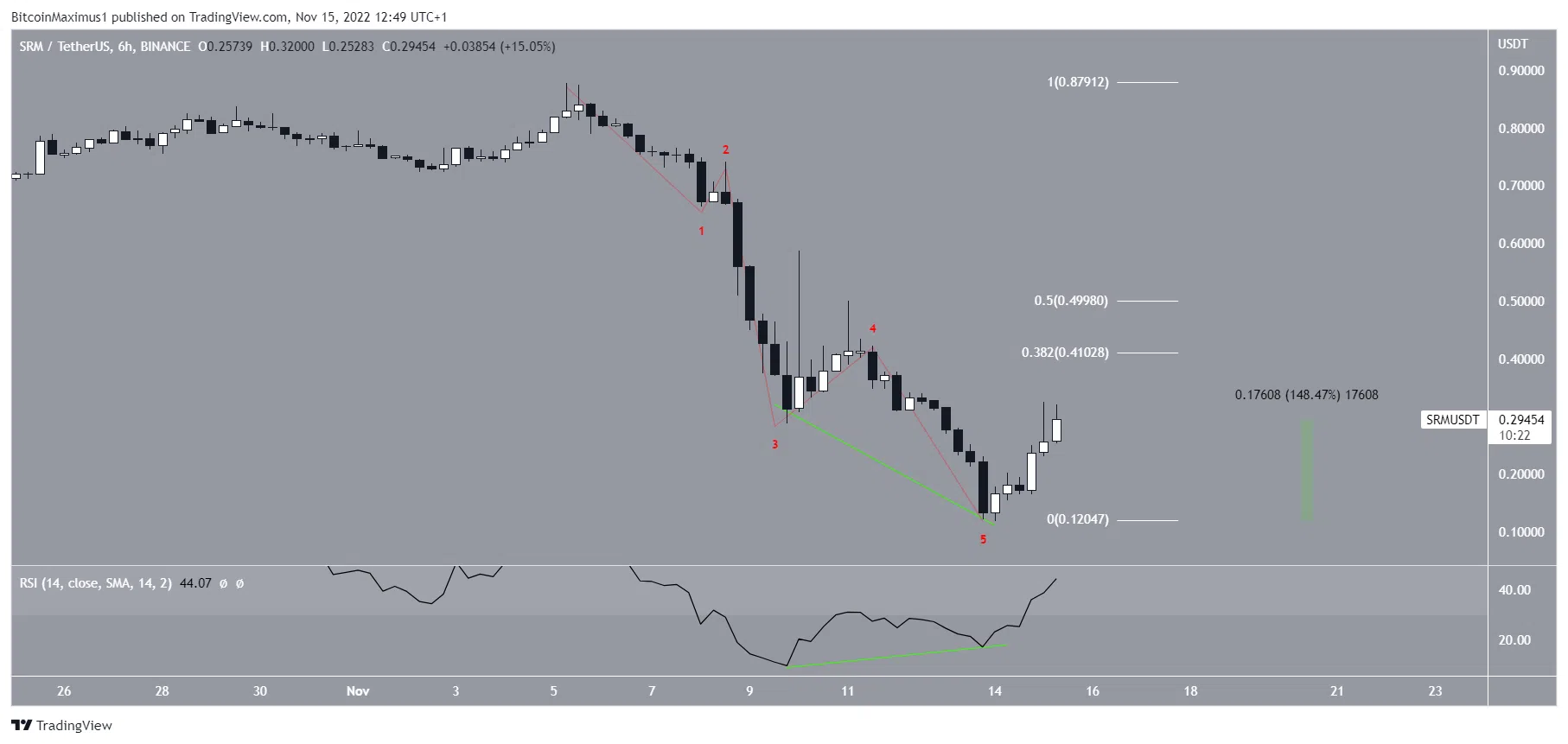 반면, 선행지수 하락은 5파동 하향 차트와 유사하게 전개 되고 있고, 세럼 가격 추세가 약세장일 것을 시사한다. 상승폭이 0.41달러와 0.5달러 사이 구간의 저항선에서 끝나고 하락세가 지속될 것으로 예상된다. 0.382-0.5 피보나치 되돌림 구간에서 저항선이 생성된다.