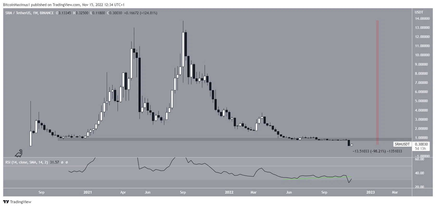 세럼(SRM) 가격의 장기적인 가격 지지선이 무너졌으며 사상 최저치 가격으로 하락할 수 있다.