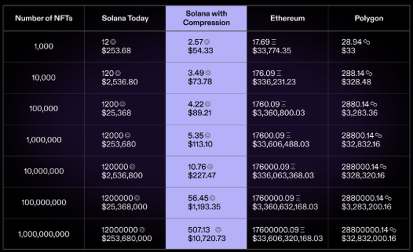 솔라나 재단이 공개한 비용 데이터에 따르면, 이 새로운 압축 NFT는 생성 비용에 있어 이더리움과 비교할 수 없을 정도로 저렴하다. 평상시 생성 비용은 폴리곤과 비슷한 수준이며, 수백만 개의 NFT를 한번에 발행하면 폴리곤보다 비용이 더 낮게 내려가는 것이 특징이다.