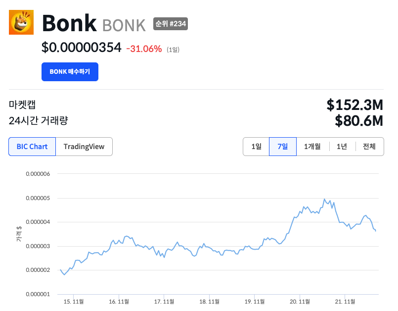 BONK는 하루 전 최고가 달성 후 11시간 만에 29% 하락했습니다. 변동성이 매우 크다는 밈코인의 특성을 여지없이 드러냈습니다. BONK에 투자할 때는 각별히 주의해야 합니다.
