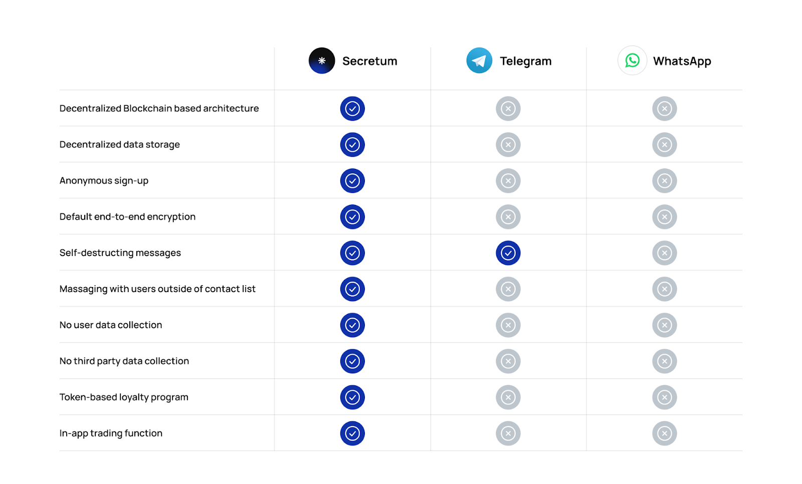 이러한 목표는 시크릿툼이 블록체인 분야의 선구자가 되기 위한 기반을 마련하고 왓츠앱과 텔레그램의 역할을 뛰어넘는 서비스로 만들 것이다.