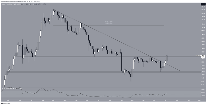 SOL의 경우 강세 추세 반전이 시작됐을 가능성이 크다. 이번 주 강세 캔들스틱은 이러한 가능성을 뒷받침한다. 현재 가격은 장기 수평 저항선인 28달러 내에서 거래되고 있다.