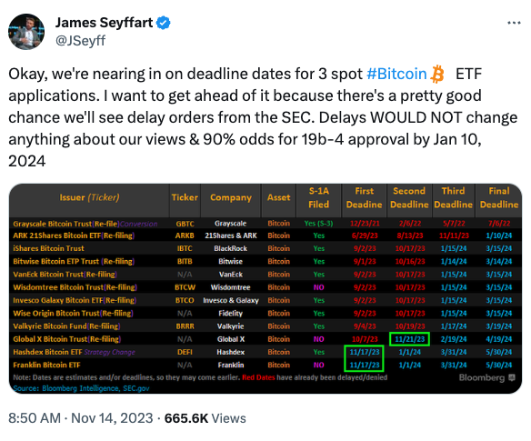 정반대 이야기: 하지만 제임스 세이파트 블룸버그 애널리스트는 지난 15일 엑스(옛 트위터)에 비트코인 현물 ETF가 내년 1월 10일까지 승인될 가능성이 약 90%라고 답했습니다. 또, 에릭 발추나스 블룸버그 ETF 전문가는 지난 8월 말, 올해 ETF가 승인될 확률은 75%, 내년 말 승인될 확률은 95%라고 주장하기도 했습니다.